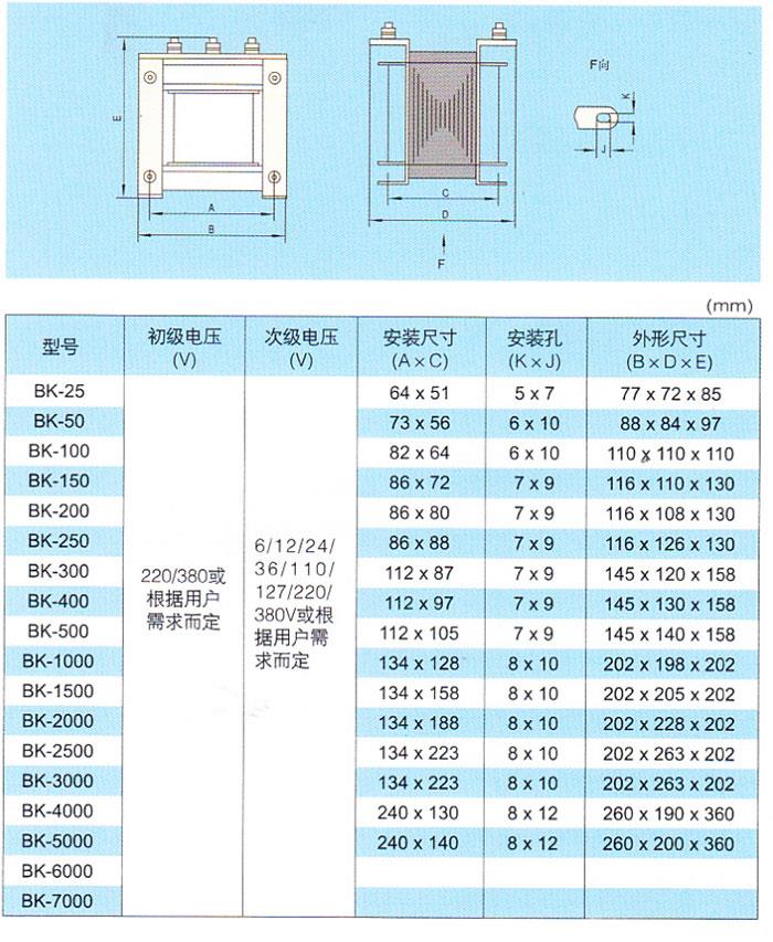 BK系列控制變壓器適用于50-60Hz的交流電路中,作為機床和機械設(shè)備中一般電器的控制電源、局部照明及指示燈電源。
